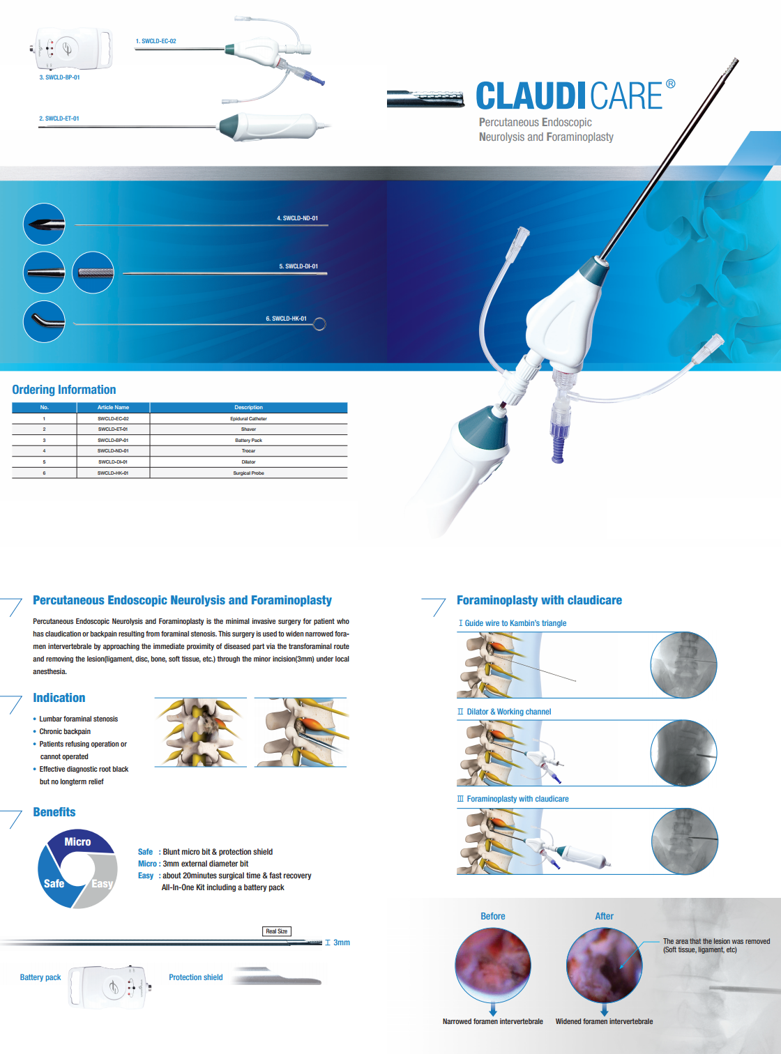 신경을 압박하는 여러 요인을 미세한 팁을 사용하여 추간공 깊은 곳까지 접근해 통증 원인을 치료하고 추간공을 확장 시킴으로써 운동성을 유지하고 신경의 압박을 풀어줍니다.