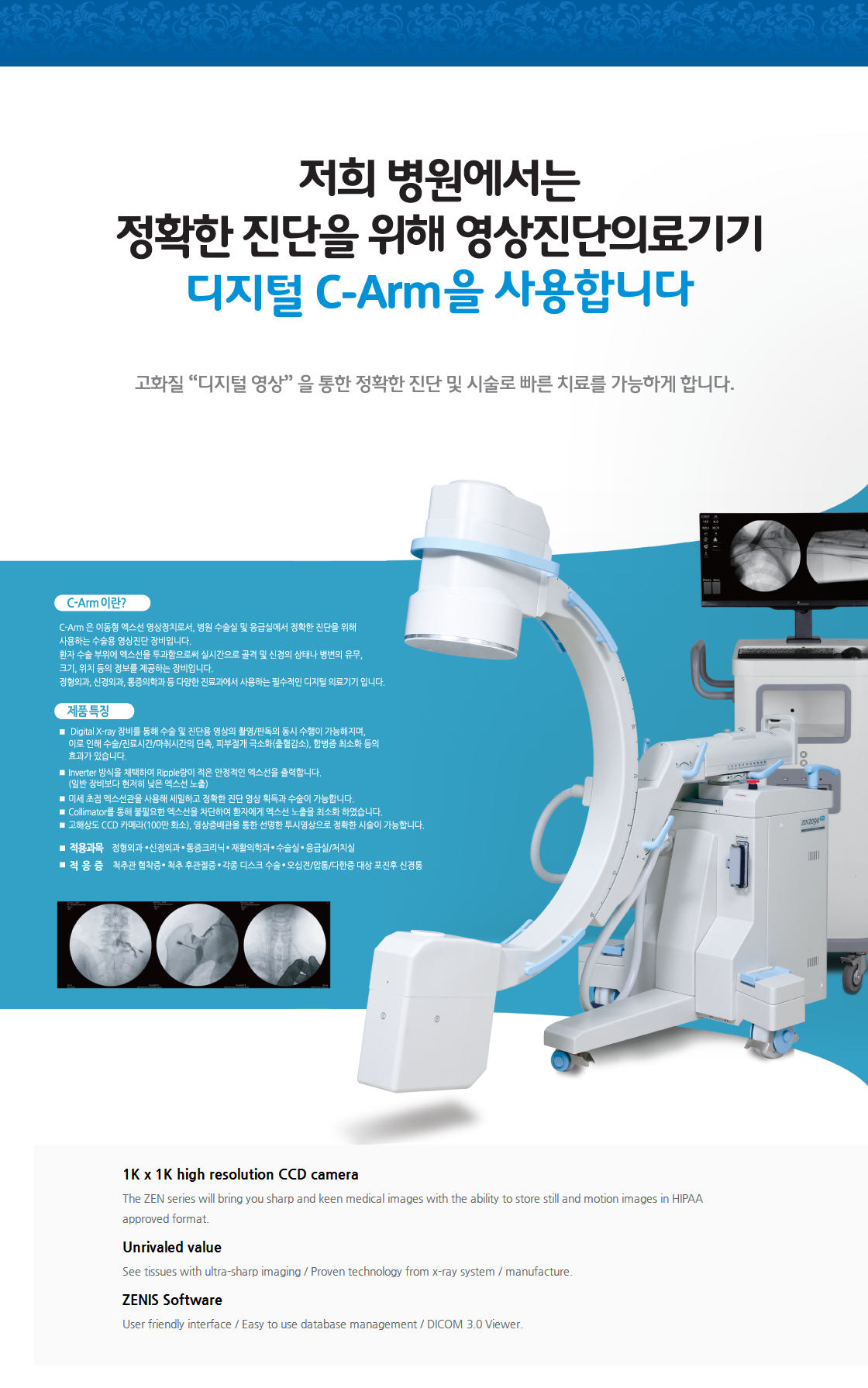 ZEN2090 Pro C-arm은 이동형 엑스선 영상장치로, 병원 수술실 및 응급실에서 정확한 진단을 위해 사용하는 수술용 영상진단 장비입니다.