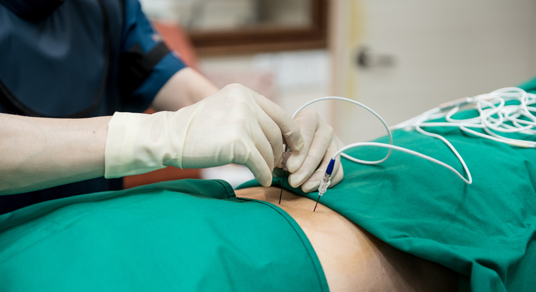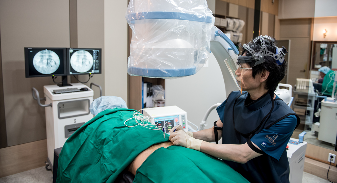 병변 부위에 고주파 바늘을 삽입하고, 고주파를 발사하여 전기 자극으로 통증을 완화시키는 치료법