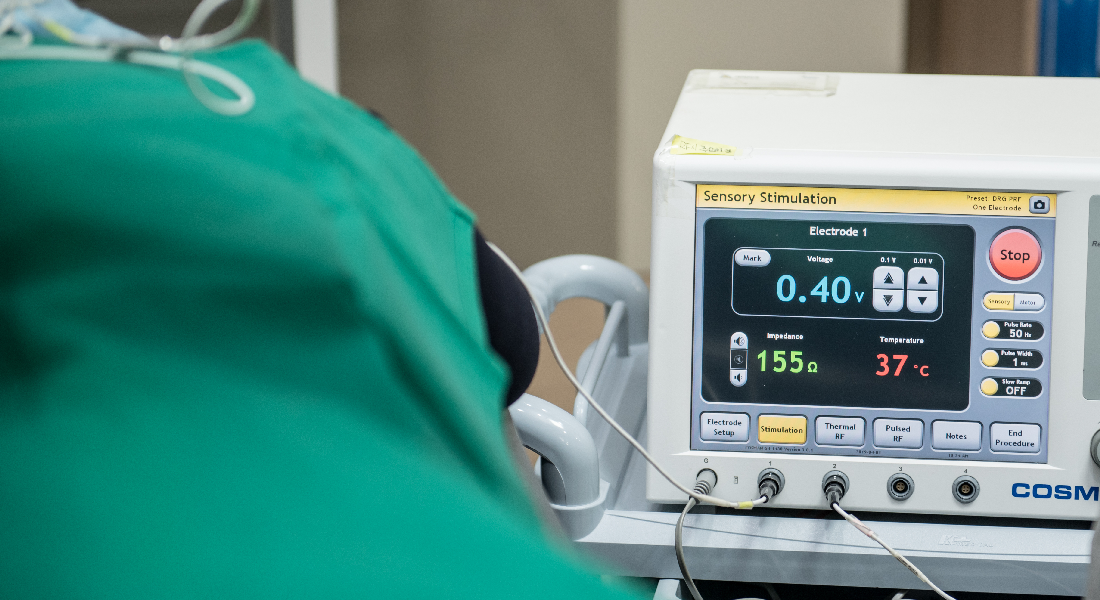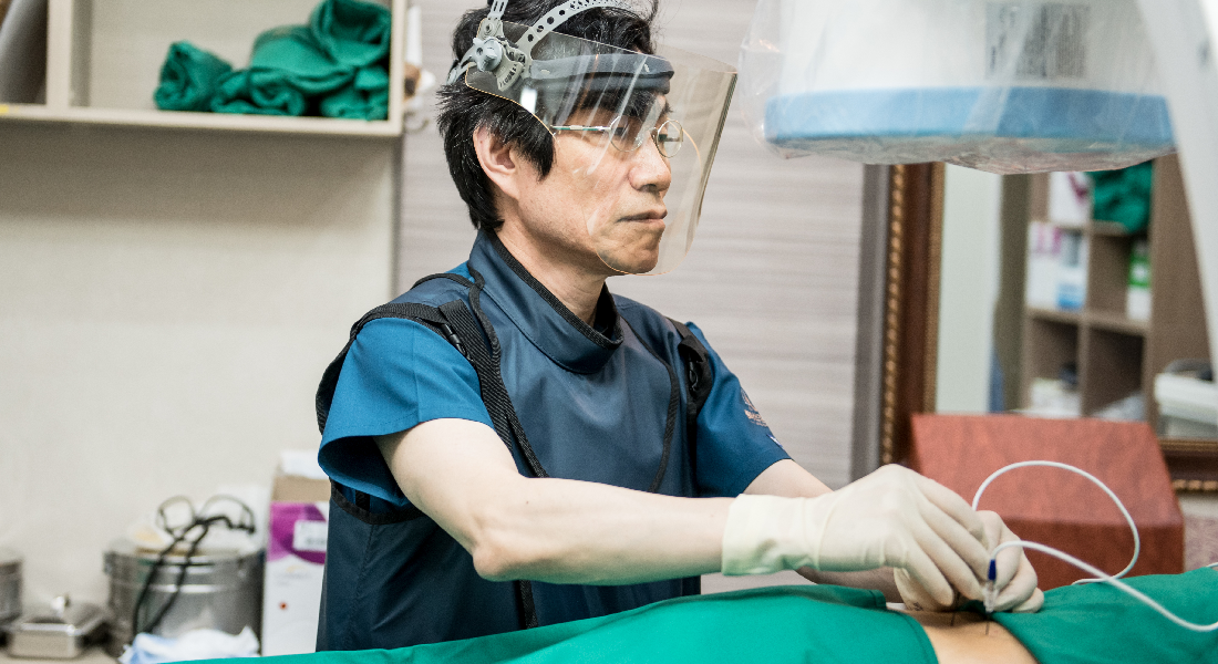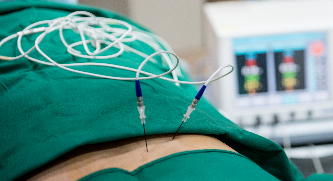 병변 부위에 고주파 바늘을 삽입하고, 고주파를 발사하여 전기 자극으로 통증을 완화시키는 치료법